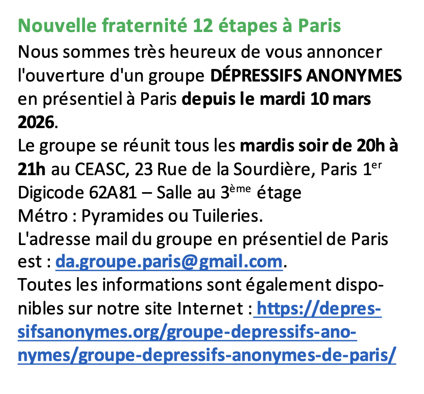 Toutes les informations sont également disponibles sur notre site Internet: https://depressifsanonymes.org/groupe-depressifs-anonymes/groupe-depressifs-anonymes-de-paris/